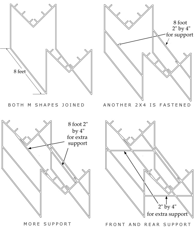 E. The M-shaped pieces are connected together with two 7 to 8-foot pieces of 2×4.