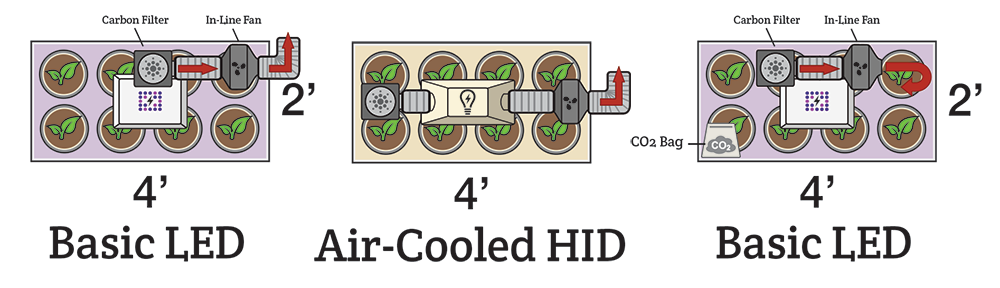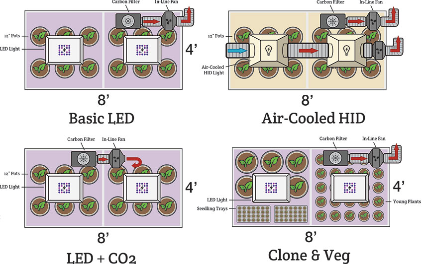 Note that the third example is a closed loop, and the inline fan circulates air within the tent without expelling it.