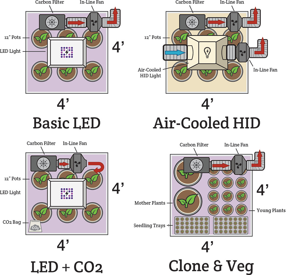 This is the smallest, most simple growing room example we will show you. The 2′ x 4′ grow tent design will allow you to grow 2-4 full sized plants, or you can substitute with smaller pots to grow more small-medium-sized plants.