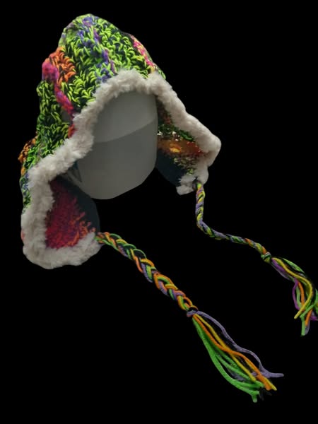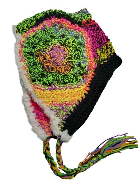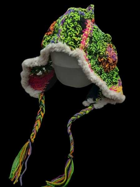 Fluffy furry handmade crochet bucket hat in earthy tones.