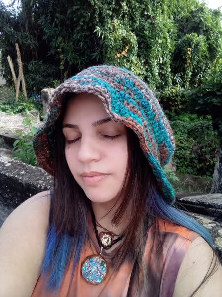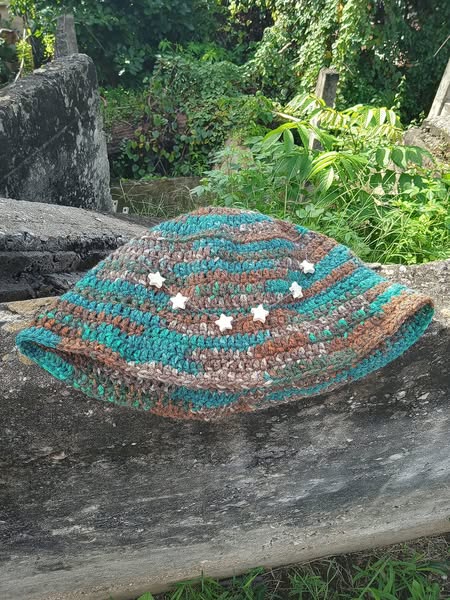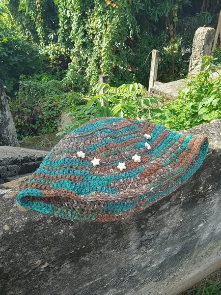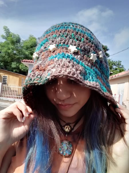 Oversized crochet bucket hat i’m earthy & celestial tones. Works quite well for those who need extra space for dreads, braids or just like larger bucket hats.
